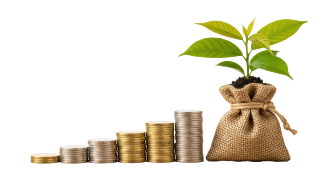 A vibrant green sapling sprouts from a rustic burlap money bag beside stacked gold and silver coins on a blurred light wooden surface with white copy space, symbolizing financial growth and prosperity