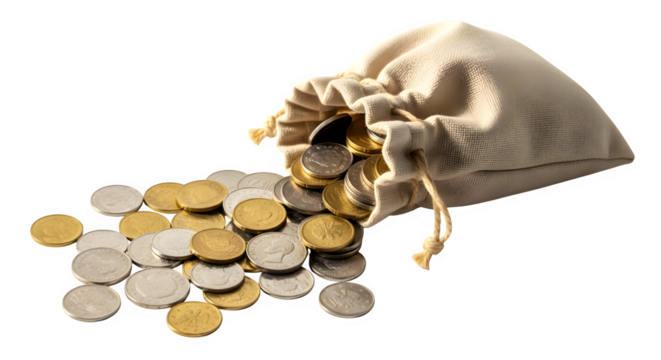 A drawstring pouch spilling gold and silver coins onto a dark surface isolated on transparent background