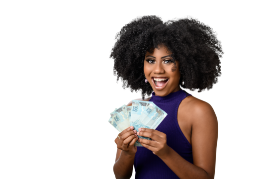 young black woman smiling holding brazilian money bills, positively surprised, space for text, person, advertising concept