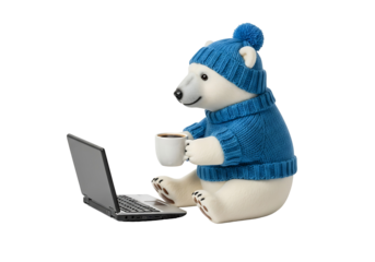 かわいいシロクマがニット帽を被って、コーヒーを飲みながらパソコンを使っているイメージ