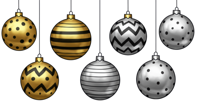 Highly reflective gold and silver christmas baubles featuring bold geometric doodle patterns and heavy black outlines, suspended against a transparent void; clean graphic design concept