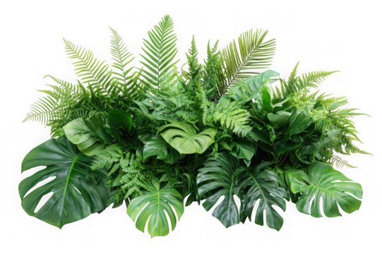 Lush green monstera and fern foliage arrangement with dark background isolated on a transparent background