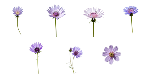 Perennial cornflower Centaurea montana flower collection with multiple angles isolated on transparent background for botanical and floral designs