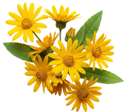Arnica montana herb and plant photo on transparent background. Herbal medication for sprains, osteoarthritis pain and bruises. PNG