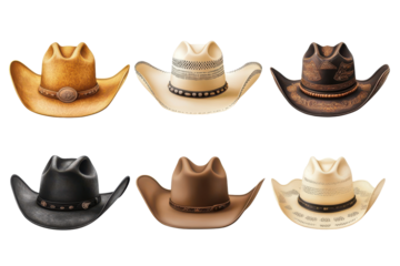 Collection of western cowboy hats in various styles and colors isolated on transparent background. Set of cowboy hats isolated on white background.