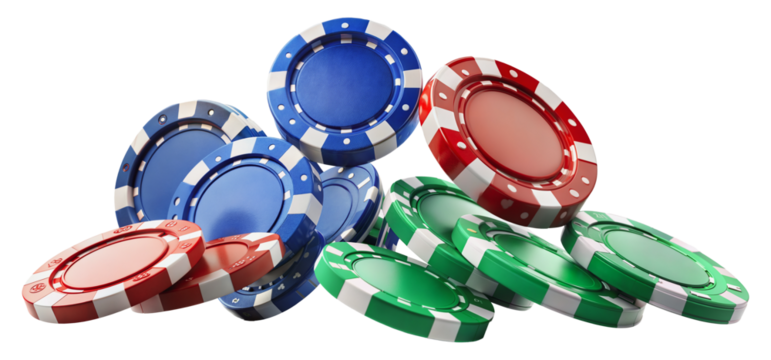 Red and blue casino chips falling on transparent background