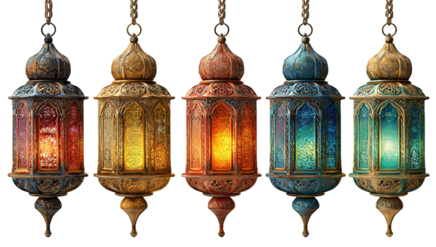 Hanging Ramadan Decorations and Ramadan in Gold Brass Letters Against a Blurred Mosque Background. RAMADAN KAREEM on light background