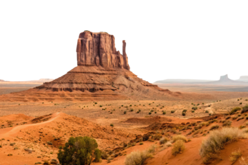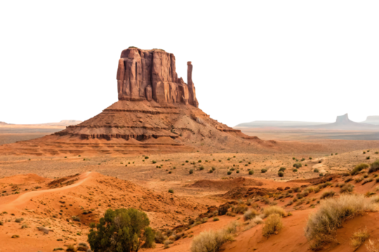 Desert landscape with prominent sandstone butte, Monument Valley formation, sparse vegetation and golden light on rock formations, isolated on a transparent background