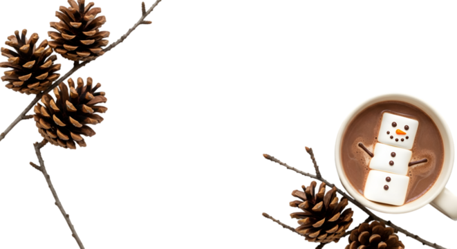 Hot Chocolate Snowman With Pine Cones Cut Out PNG.