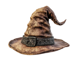 moonlit mage hat with weathered texture and detailed buckle, isolated on transparency background, evokes sense of mystery and magic
