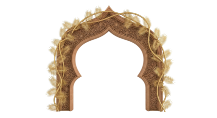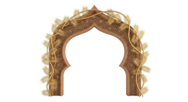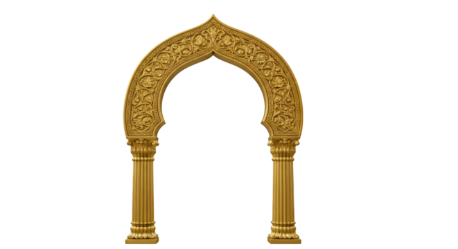 Golden moorish archway framing intricate architectural detail, representing islamic design heritage against clean transparent backdrop