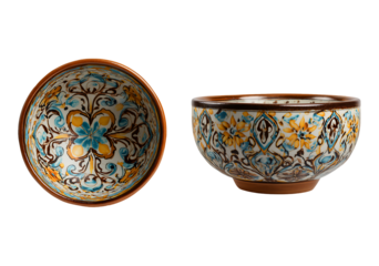 Hand-Painted Ceramic Bowls with Intricate Blue and Yellow Floral Design isolated on transparent background