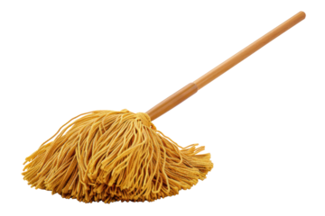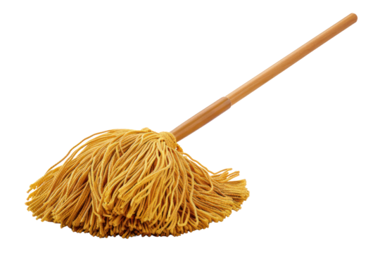 Yellow mop with wooden handle isolated on white background. Perfect for cleaning products, janitorial services, or household chores.