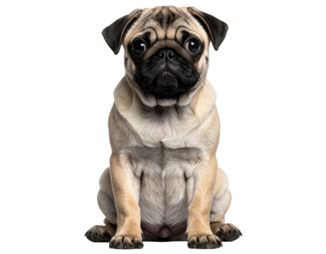 Pug wearing red bow tie sitting upright isolated on transparent background