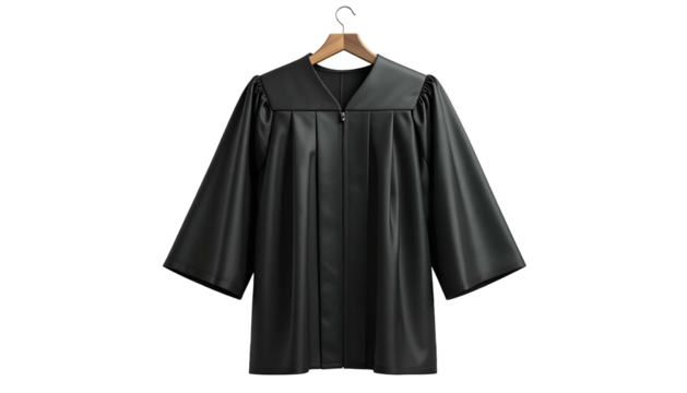 Studio shot of a black judge's robe with wide sleeves hanging on a wooden hanger