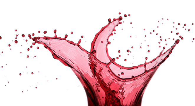 A vibrant red wine splash bursts from a glass as more of the rich liquid pours in, isolated against a crisp white backdrop