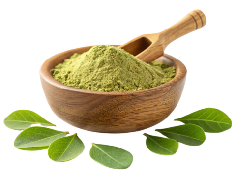 Moringa powder in a wooden bowl with moringa leaves  isolated on white background. Suitable for marketing or business purposes. PNG file