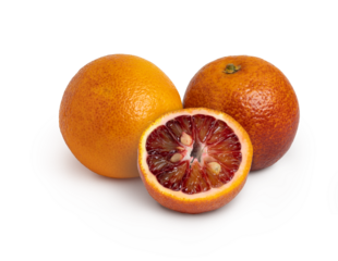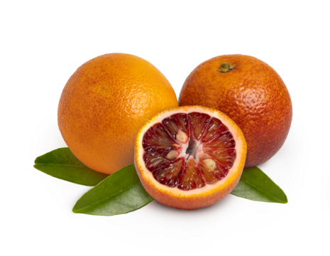 Whole and halved blood orange displaying vibrant deep red flesh closeup