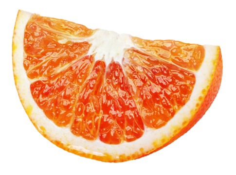 Ripe wedge of blood red orange citrus fruit isolated on transparent background. Sanguinello blood orange slice