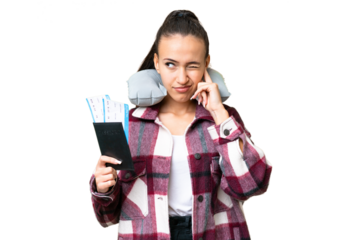 Young Traveler woman holding a passport over isolated chroma key background frustrated and covering ears