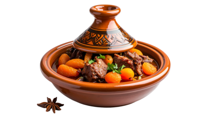 Authentic Moroccan lamb tagine with tender lamb, prunes, almonds, and glossy sauce in earthenware, on transparent, soft studio lighting. Appetizing Moroccan culinary masterpiece