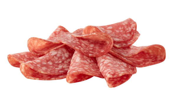 Pile of salami slices with cured meat texture detail isolated on white background