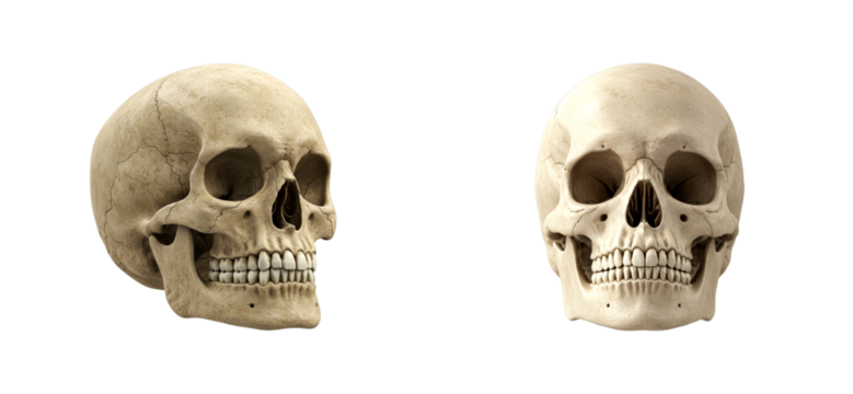 Two anatomically correct human skulls presented in a frontal and profile view, showcasing realistic bone texture, sutures, and teeth for scientific or educational purposes