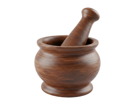 Wooden mortar and pestle with spices and herbs with transparent background