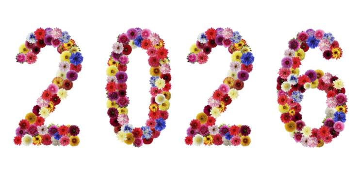 the year 2026 artfully composed from a vibrant mosaic of colorful assorted flowers, blooming with a rich palette of red, pink, yellow, blue, and purple hues.