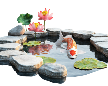 Koi fish swimming in a serene pond surrounded by lotus flowers and stones.