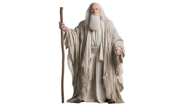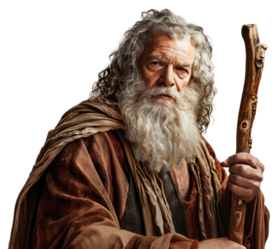 Moses full body on transparent background. Biblical Old Testament leader holding staff, standing isolated for Christian art, teaching, and religious graphic design.
