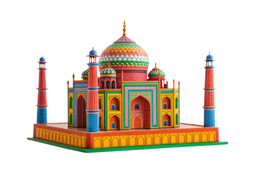 Large mosque with minarets and palm trees on green lawn isolated on transparent background