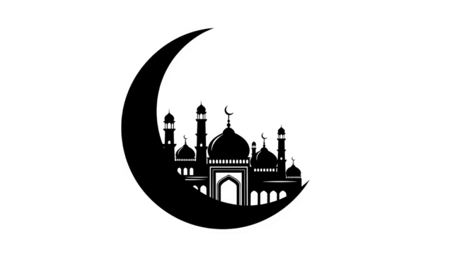 Silhouette of a mosque inside a crescent moon for islamic holidays and ramadan celebration isolated on transparent background
