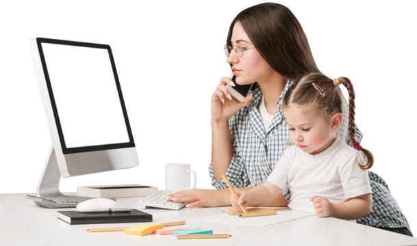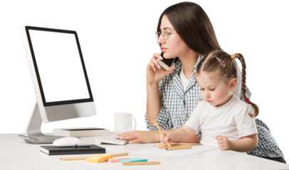 Happy busy mother working with a child on laptop