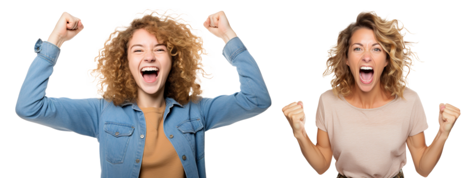 emotional, happy, excited, cheering Caucasian mother and teenage daughter celebrating. on transparent background
