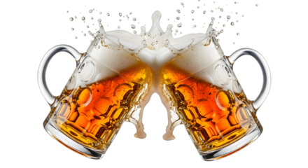 Two beer mugs clinking together with a splash of beer and foam, isolated on transparent background