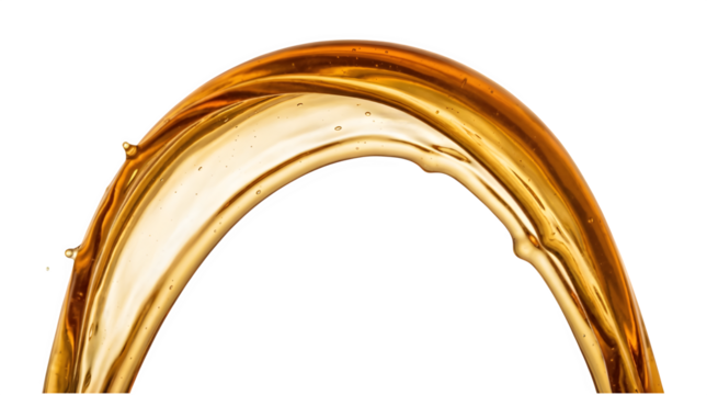Golden liquid splash with white foam isolated on transparent background. Golden liquid stream isolated on white background.