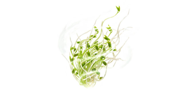Fresh green sprouts or microgreens splashing in clear water, representing washing, hygiene, and healthy eating on a transparent background.