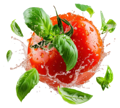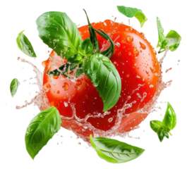 PNG Flying tomato with splashes and basil leaves vegetable plant herbs.