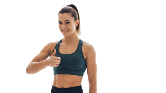 A fit woman, sporting athletic attire, gives a thumbs-up. The woman is smiling, her posture is confident, and she appears in great shape