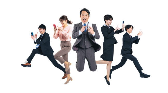 スマホを使いながらジャンプするビジネスパーソンのグループ 切り抜き背景透過PNG(1人ずつの画像も販売しております。作成者リンクからPNGで検索してください)