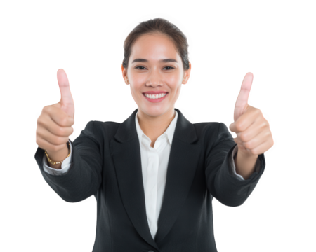 Confident woman in a professional suit giving a thumbs up. set against a clean white background. conveying positivity and success. ideal for business and motivational themes