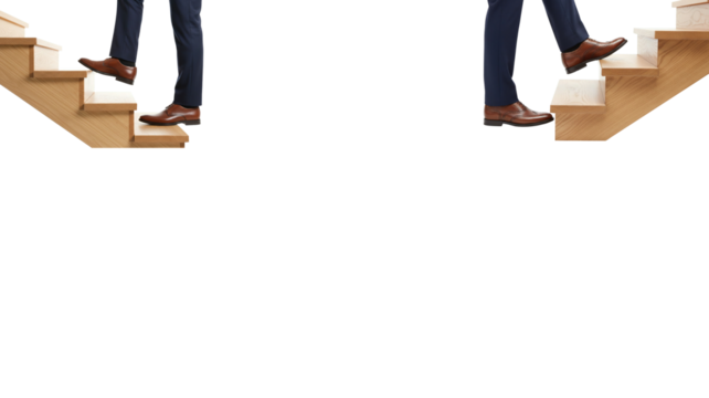 Man stepping up stairs isolated on white background, symbolizing career growth, success, progress, achievement, and personal development.