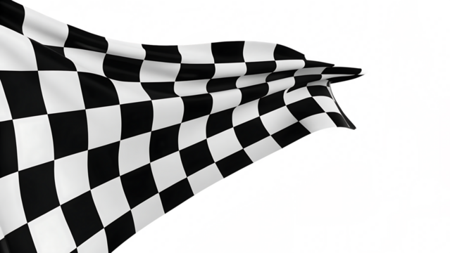 Elegant image of a black and white checkered racing flag waving, isolated on white. Perfect for motorsport, victory themes and design.  Symbolic