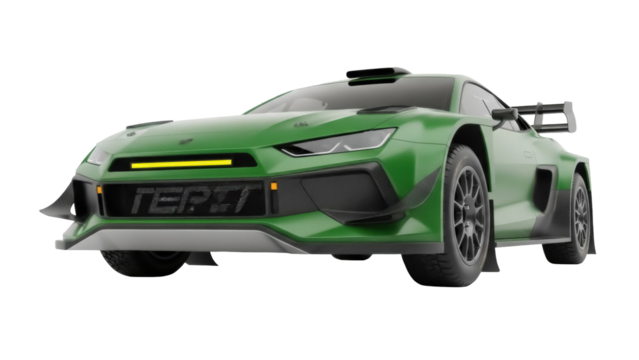Green rally car PNG isolated, racing vehicle with spoiler on transparent background, motorsport automobile for design and commercial use