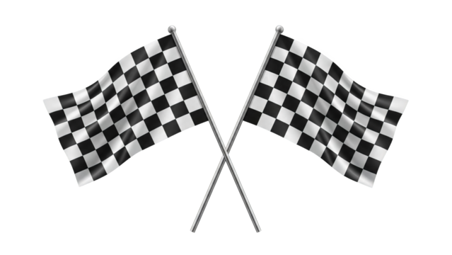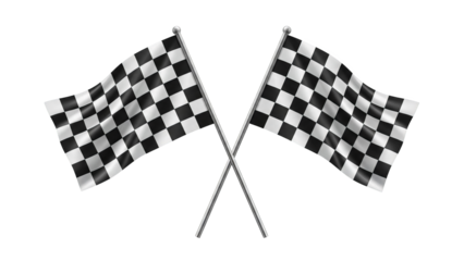 Crossed checkered racing flags for motorsport finish line, speed and competition isolated on transparent background