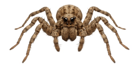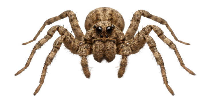 Wolf spider with mottled brown and gray coloration and two prominent front eyes