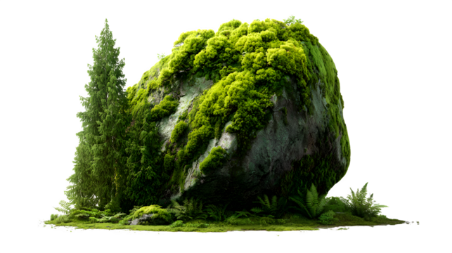A single, massive boulder covered in vibrant green moss and fern, standing as a silent sentinel within a quiet, ancient forest, isolated on a Transparent background