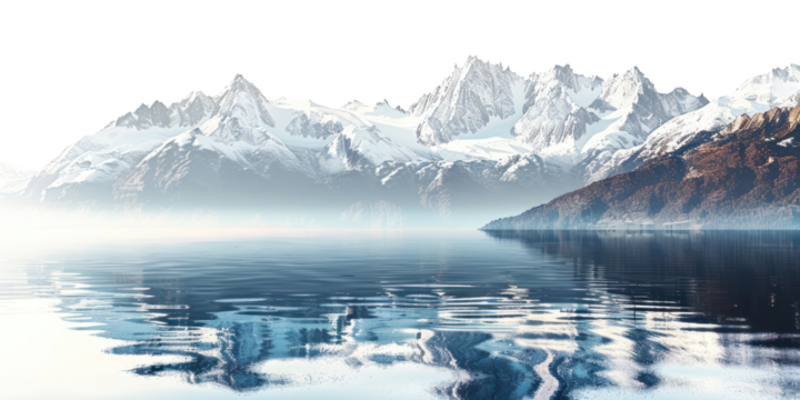 Mountain lake, serene with lone canoeist at sunrise and reflections on water, cutout, PNG isolated on white or transparent background