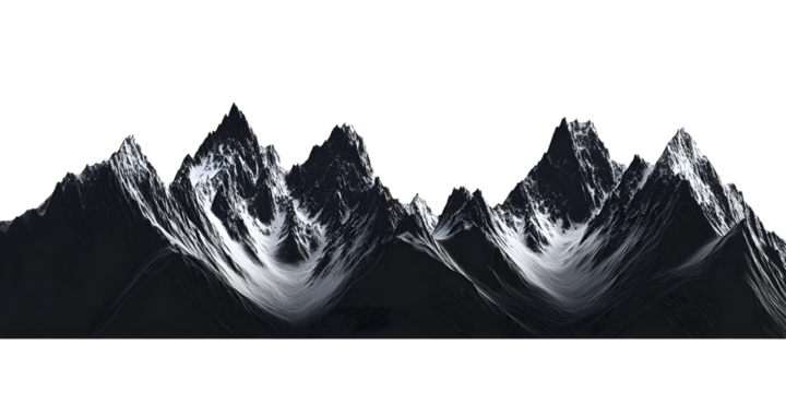 Silhouette of a rugged mountain range against a stark white background creating a strong visual contrast
